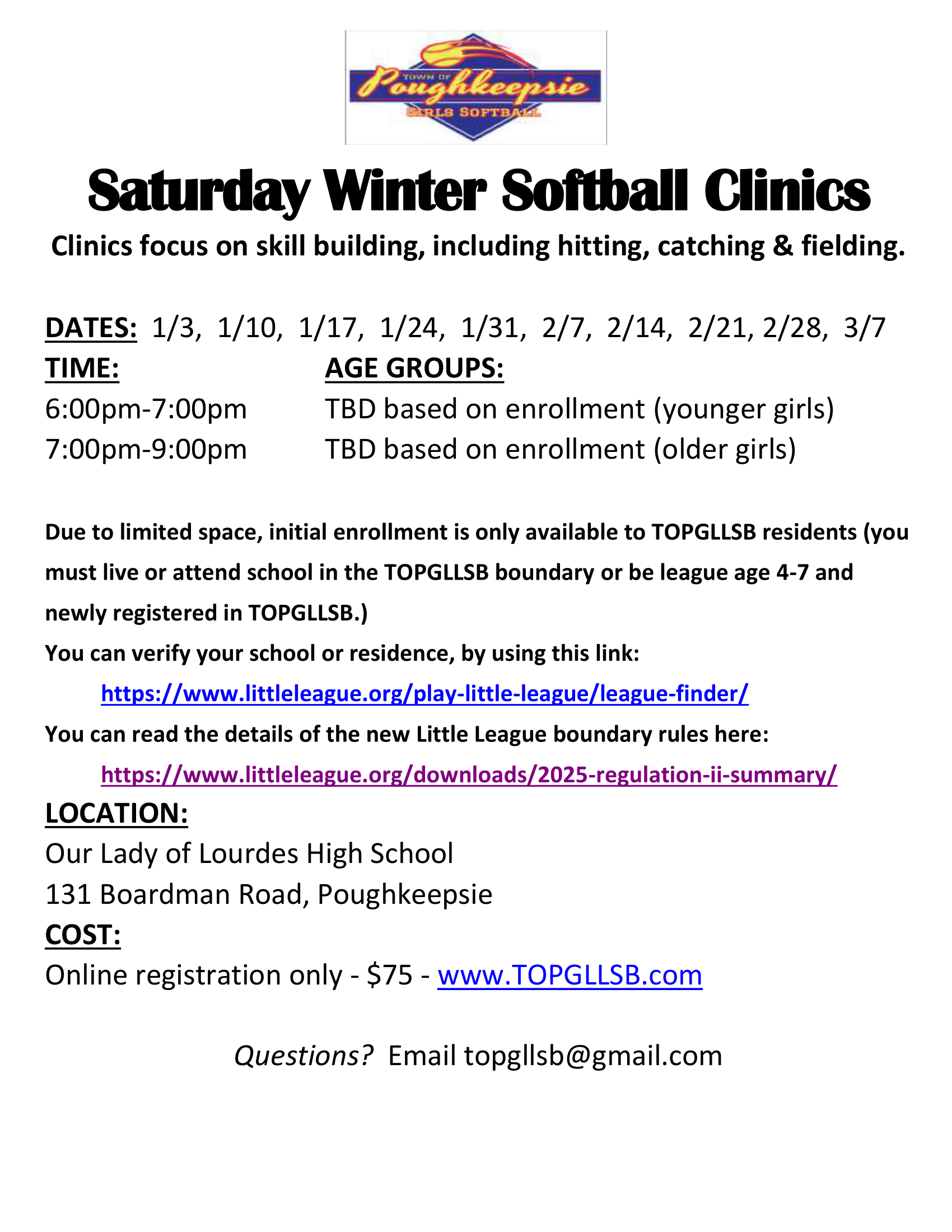 Join us for our popular winter softball clinics every Saturday from January 3rd to March 7th, 2026 at Our Lady of Lourdes High School.